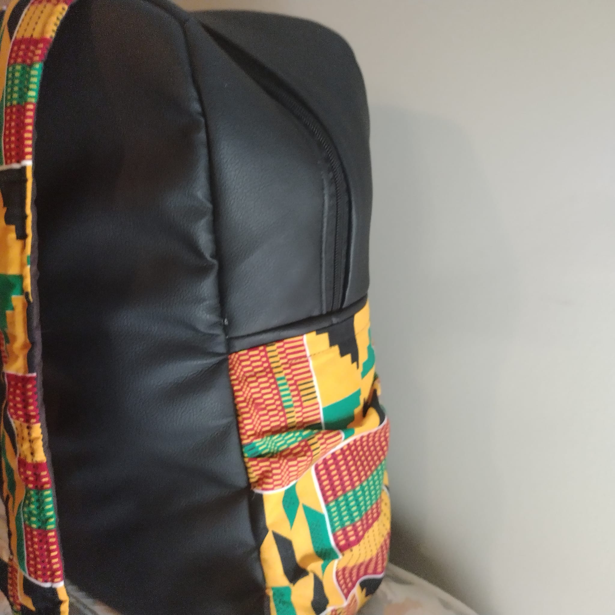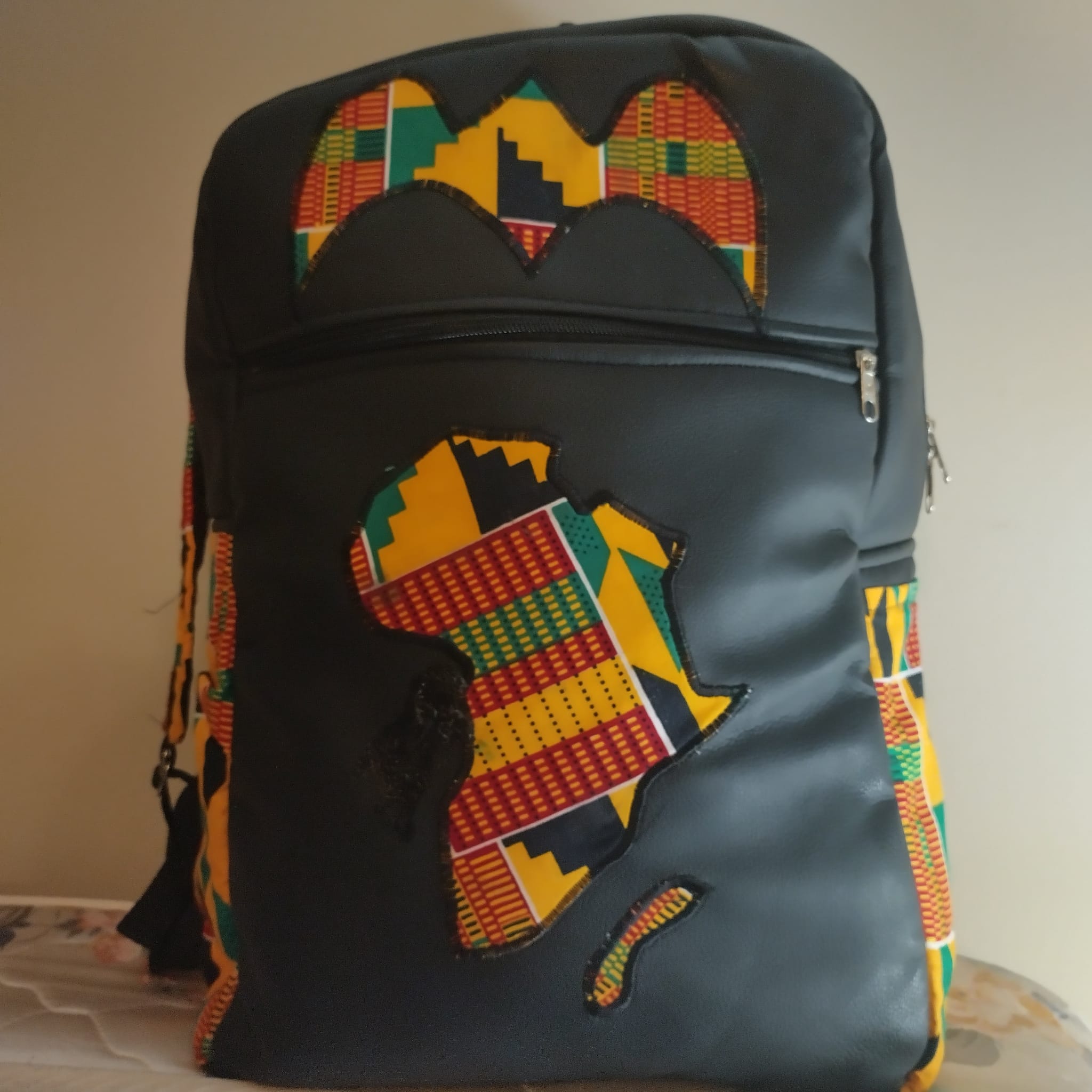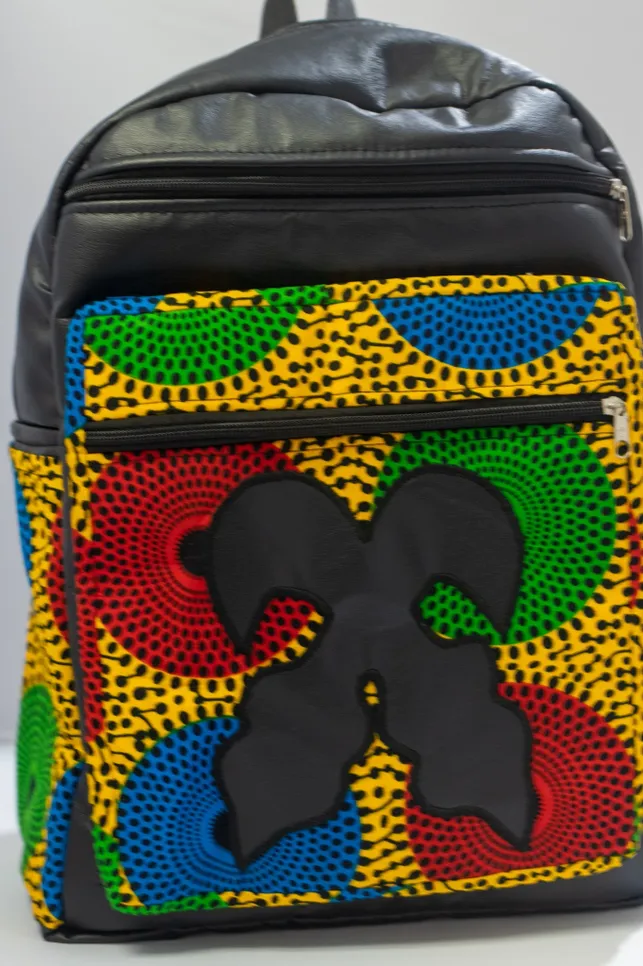 Our backpacks are handmade and imported from Ghana. Multiple pockets and durable for all your needs. This one features an edgy leather look accompanied by an Adinkra applique.