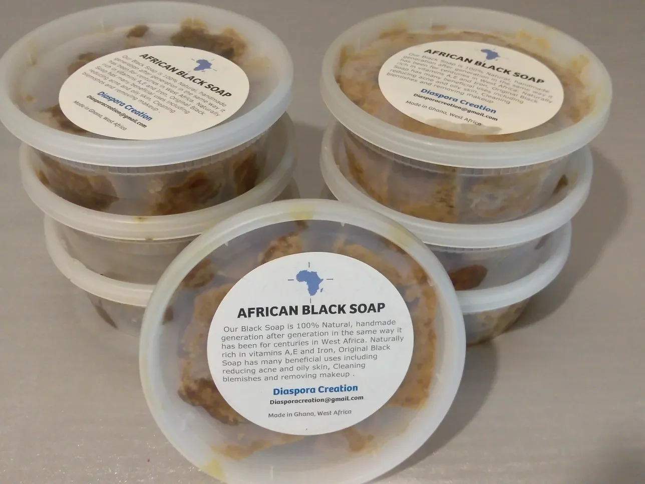 Raw African Black Soap 100% natural. Traditionally used for eczema, acne, dark spots, dryness, and sensitive skin. Unscented.